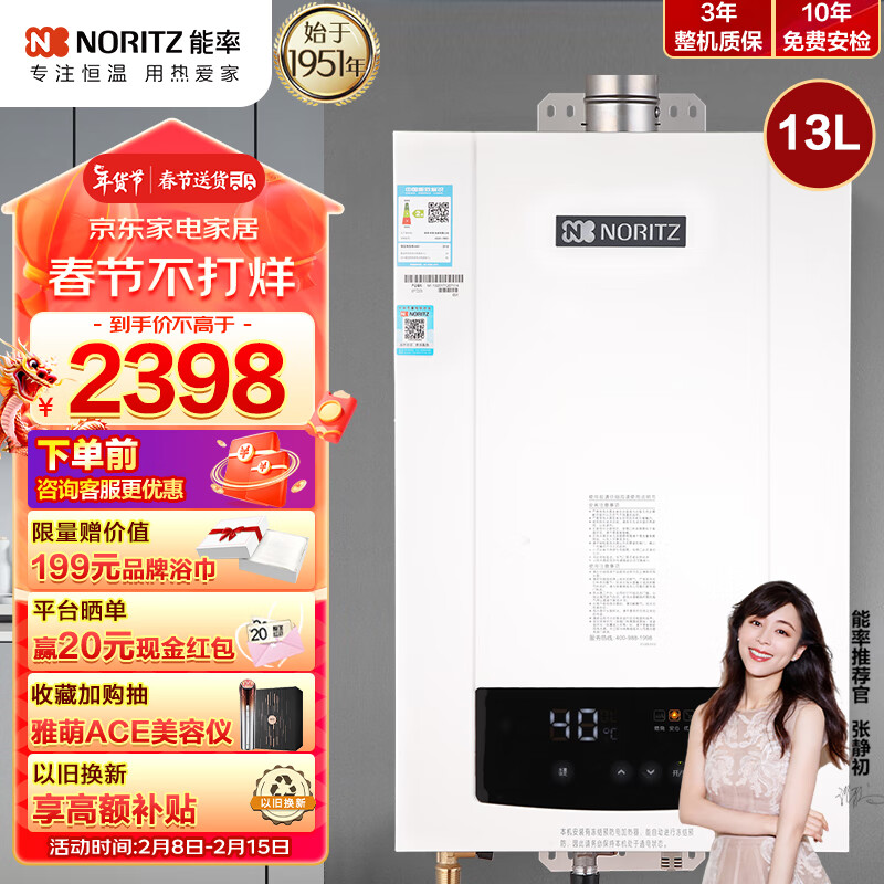 能率(NORITZ)燃气热水器13升 降噪恒温 CPU智能控制系统GQ-13TBG3FEX(JSQ25-TBG3)天然气 防冻家用价格:2398.00元!