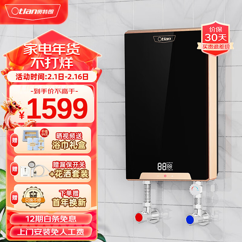 奥特朗 otlan F16H-Z85A 即热式电热水器 家用小型速热免储水 快热式恒温淋浴机【0-8.5KW智能变频】价格:1599.00元!