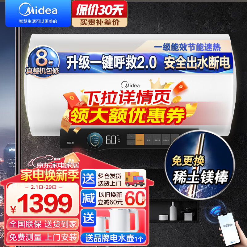 美的(Midea)60升电热水器电8倍大水量储水式稀土免换镁棒出水断电一键呼救变频速热以旧换新F6033-CA3S(HE)价格:1399.00元!
