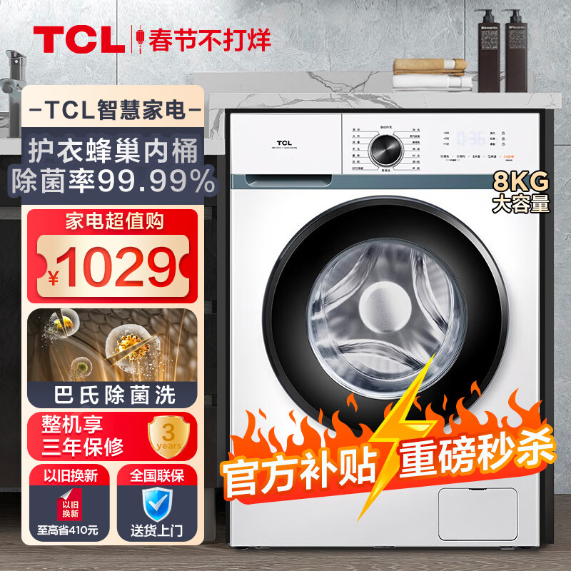 TCL 8KG变频滚筒家用超薄嵌入 除菌除螨一级能效洗脱一体 全自动家用洗衣机滚筒 8KG滚筒价格:1029.00元!