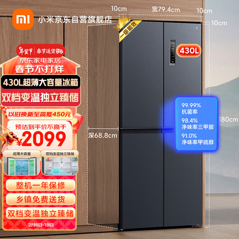 米家小米430升分区养鲜超薄大容量十字对开门双开门家用冰箱 一级能效银离子除菌净味BCD-430WMSA价格:2099.00元!