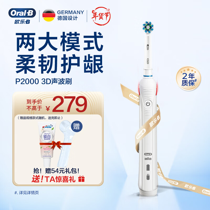 欧乐B电动牙刷成人 P系列圆头牙刷 情侣礼物3D声波旋转摆动充电式 日常清洁P2000白 博朗精工情人节礼物价格:309.00元!