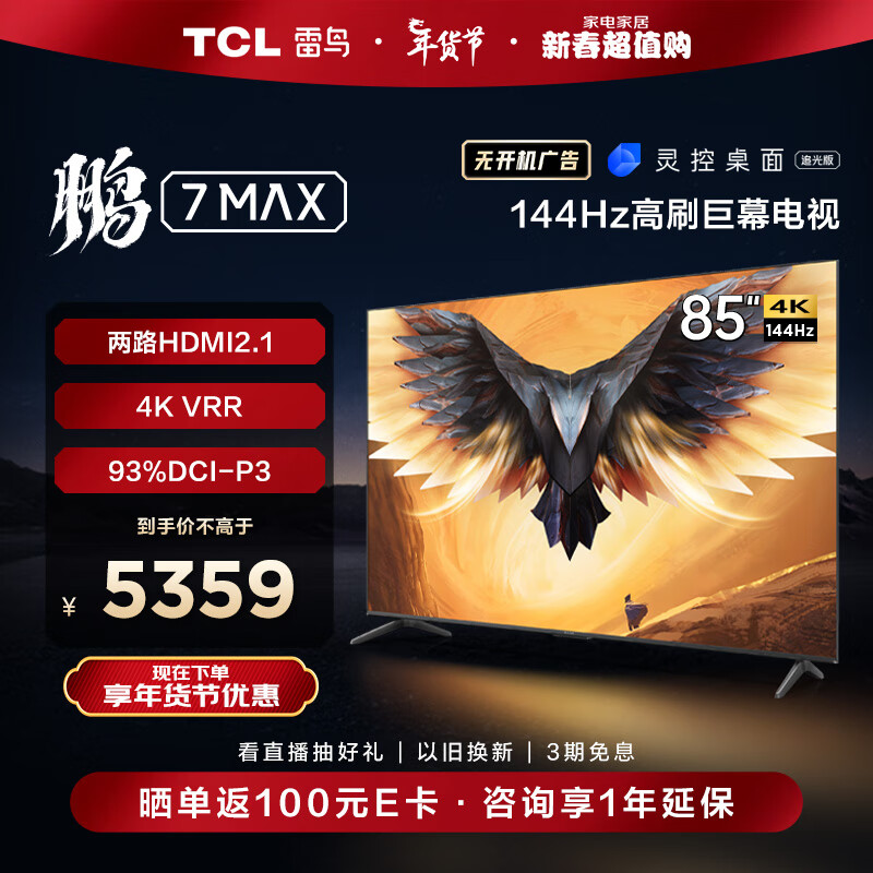 TCL雷鸟 鹏7MAX 85英寸游戏电视 144Hz高刷 HDMI2.1 3+64GB 4K超高清 液晶巨幕平板客厅电视机85S575C价格:5359.00元!