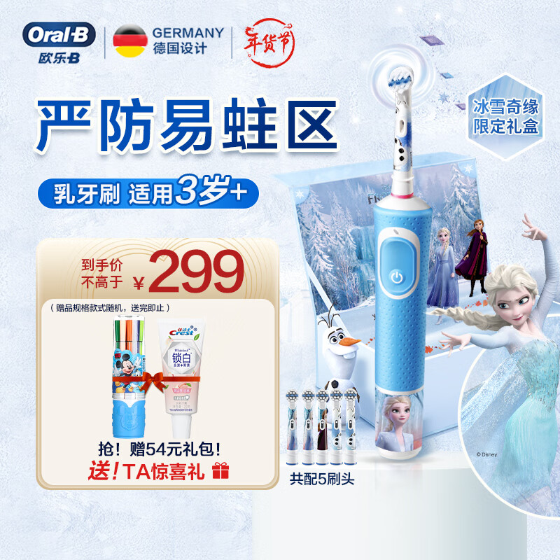 欧乐B儿童电动牙刷儿童 3-7岁乳牙刷D100K冰雪奇缘礼盒(图案随机)刷头*5 日常清洁生日礼物春节送礼价格:329.00元!