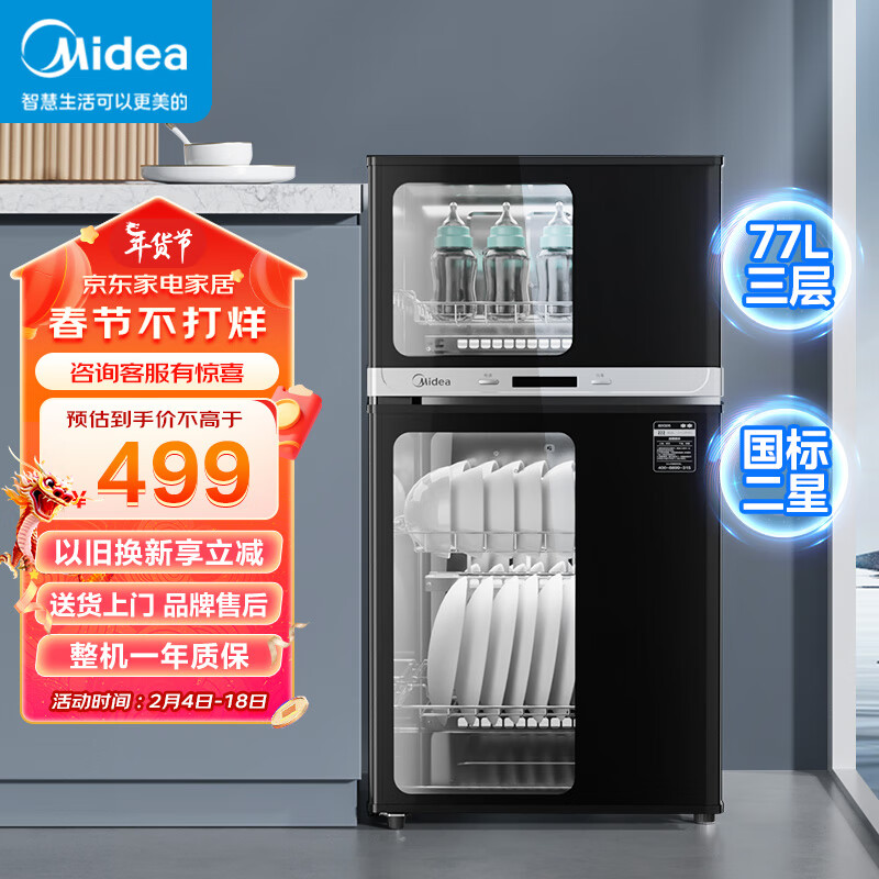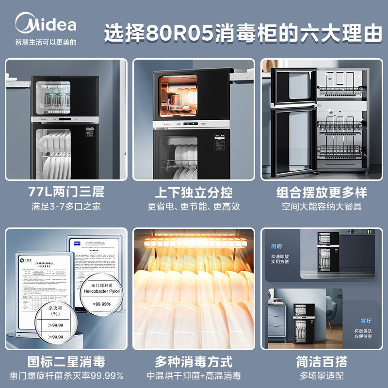 美的(Midea)消毒柜家用 厨房餐具碗柜碗筷茶杯消烘一体机 小型立式 婴儿奶瓶 77L三层 高温二 80R05价格:468.90元!