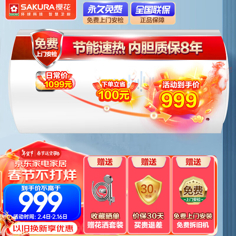 樱花(SAKURA)80升电热水器 速热大水量 家用储水式热水器 大功率节能保温 SHW-80QY05价格:999.00元!