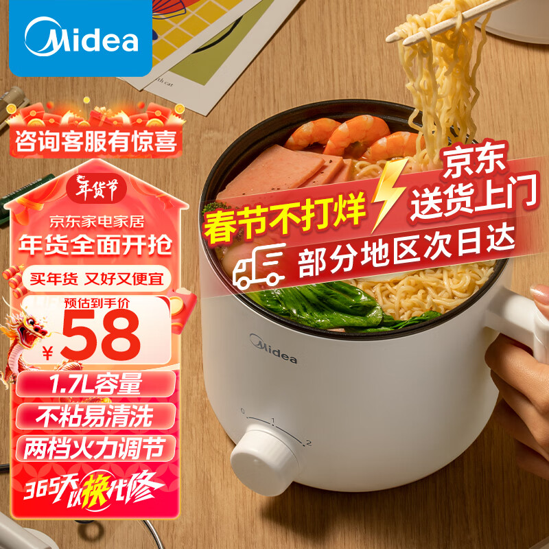美的(Midea)电煮锅 电热锅 小电锅 宿舍小锅 电蒸锅 学生寝室一体泡面小火锅多功能锅 XZE1612 1.7L价格:58.00元!