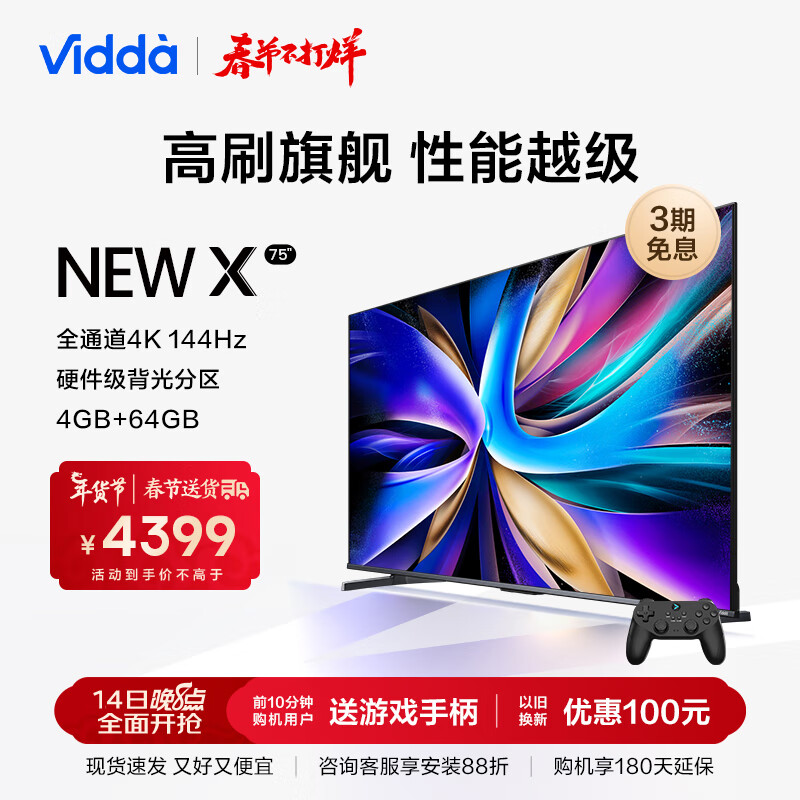 Vidda NEW X75 海信 75英寸 游戏电视 144Hz高刷 HDMI2.1金属屏 4+64G 液晶巨幕以旧换新75V3K-X价格:4399.00元!