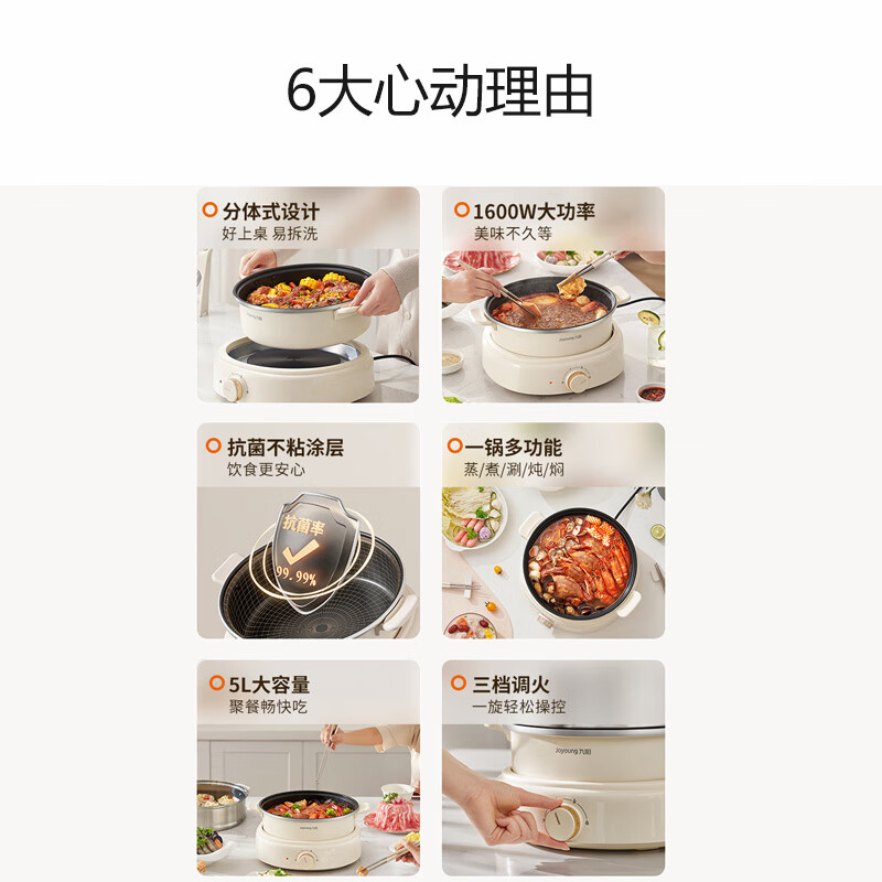 九阳(Joyoung)电火锅家用电蒸锅大功率上蒸下煮分体式涮肉火锅大火力多功能不粘5L年货送长辈送老人蒸屉款G525S价格:167.90元!