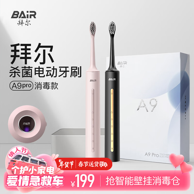 拜尔A9pro 智能杀菌电动牙刷成人声波充电式震动软毛情侣学生党智能自动男女士 送女朋友 桃粉价格:199.00元!