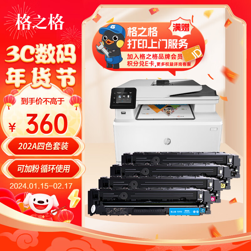 格之格202a硒鼓适用惠普m281fdw硒鼓hp m254dw m254nw m281fdn m280nw打印机墨粉盒带芯片四色套装cf500a硒鼓价格:409.00元!