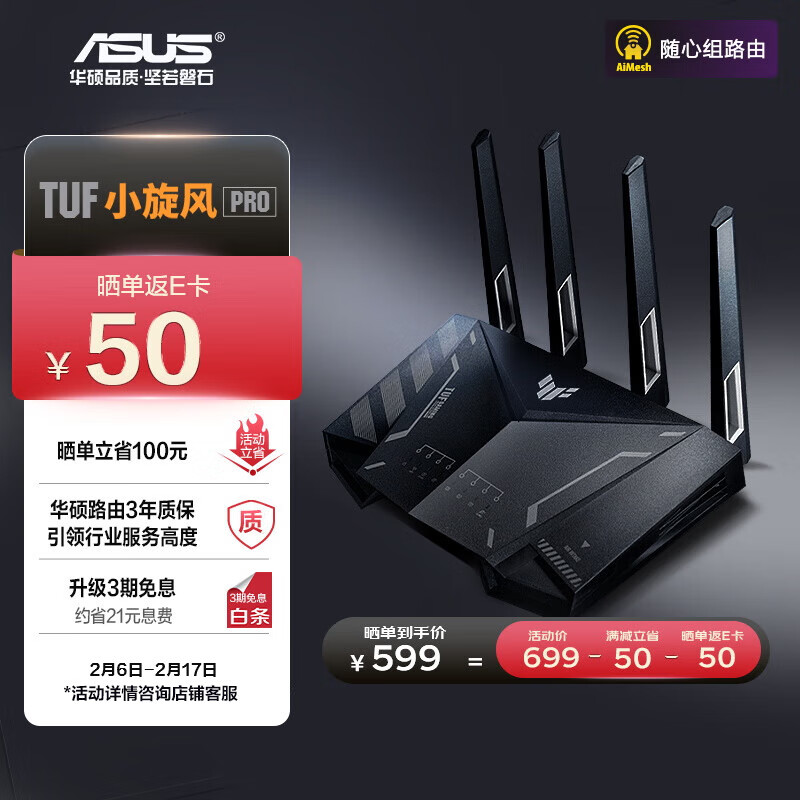 华硕(ASUS)TUF小旋风Pro全千兆电竞无线路由器/穿墙全屋WiFi6/双2.5G口/家长路由价格:699.00元!