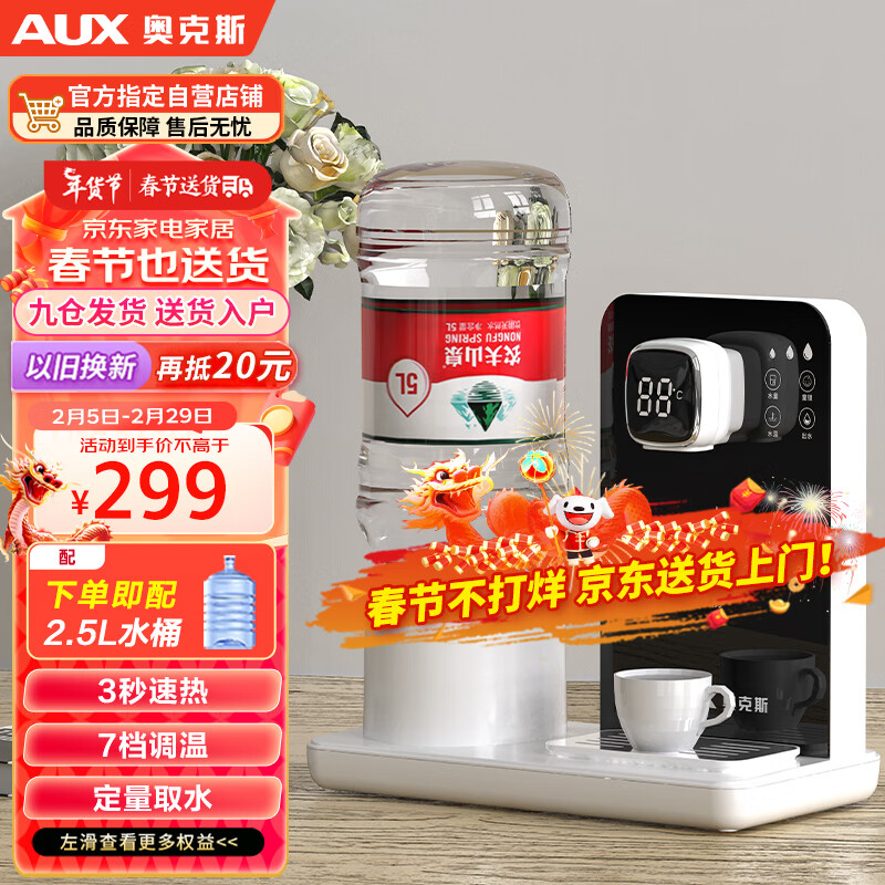 奥克斯(AUX)即热式饮水机 家用速热饮水机 办公室小型台式迷你智能饮水器【2.5L水桶】价格:299.00元!
