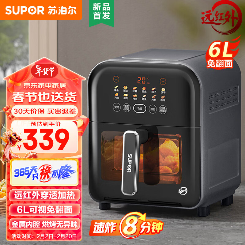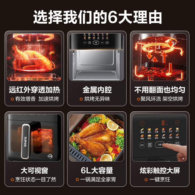 苏泊尔(SUPOR)不用翻面 空气炸锅 6L家用大容量 远红外穿透加热 炫彩智能触控 全金属可视炸锅 KD60Y865价格:339.00元!