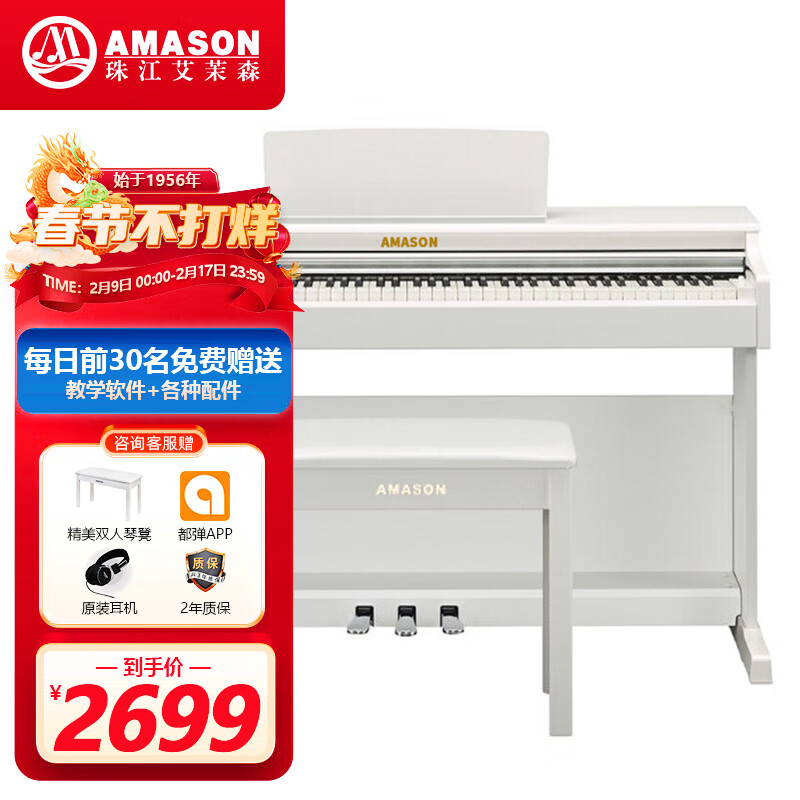 艾茉森(Amason)珠江钢琴 考级电钢琴88键重锤数码电子钢琴专业成人儿童V03S白色价格:3299.00元!