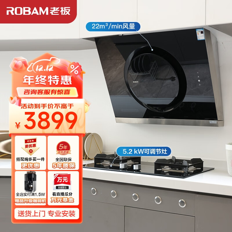 老板(Robam)抽油烟机大吸力免拆洗小尺寸油烟机家用侧吸22m3/min燃气灶灶具烟灶套装26A5SH+57B2D天然气价格:3899.00元!