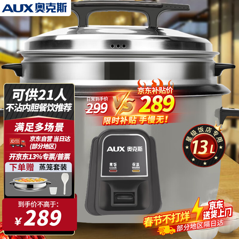 奥克斯(AUX)商用电饭锅酒店大电饭煲食堂用饭店西施保温蒸饭锅 大型电饭锅蒸笼 13升+蒸笼 适用15-21人价格:289.00元!