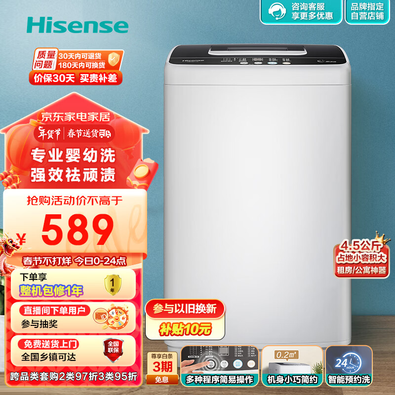 海信(Hisense)波轮洗衣机全自动 4.5公斤小型洗衣机 家用租房宿舍神器 迷你洗脱一体机 婴儿洗 HB45D128以旧换新价格:589.00元!