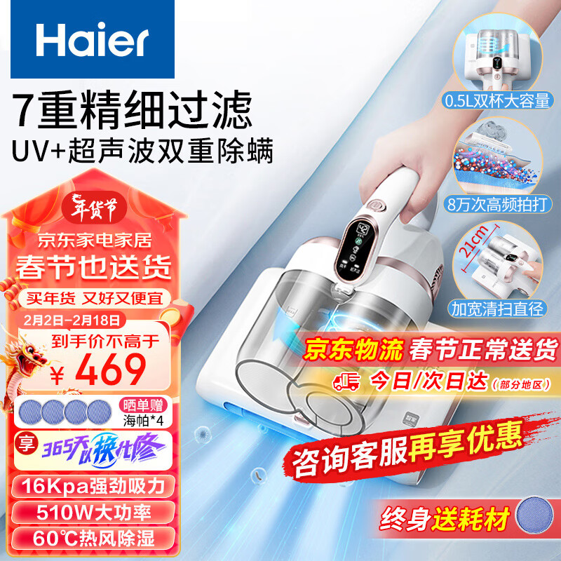 海尔(Haier)除螨仪家用手持床上大吸力双杯智能除螨仪 超声波紫外线杀菌去螨虫 热风除湿 HZ-C9W价格:489.00元!