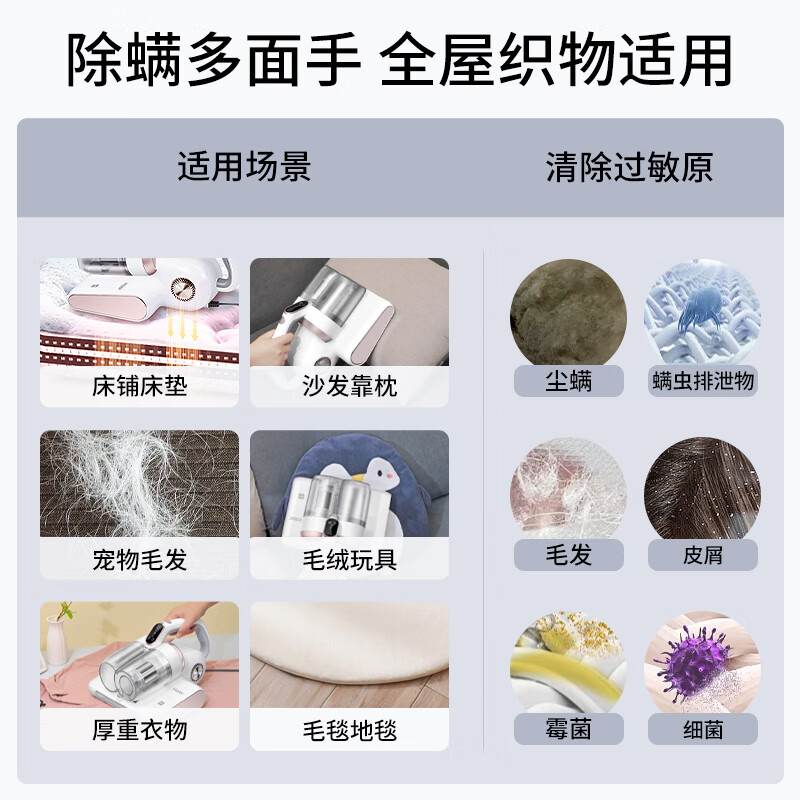 除螨方式:吸附除螨,超声波除螨,紫外线除螨