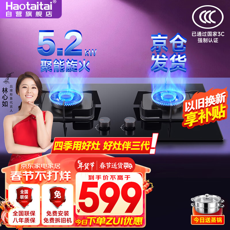 Haotaitai用心爱好太太燃气灶家用5.2KW天然气燃气灶台嵌入式猛火燃气灶双眼灶具煤气灶双灶2195A-S-天然气价格:591.00元!