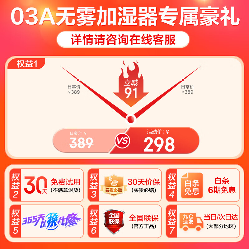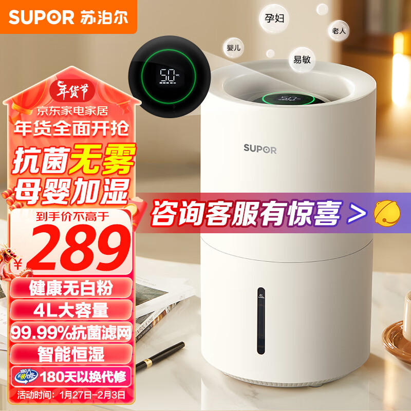 苏泊尔(SUPOR)无雾加湿器4L大容量卧室婴儿孕妇家用除菌空气加湿器办公室桌面轻音上加水EHTN-03A价格:319.00元!