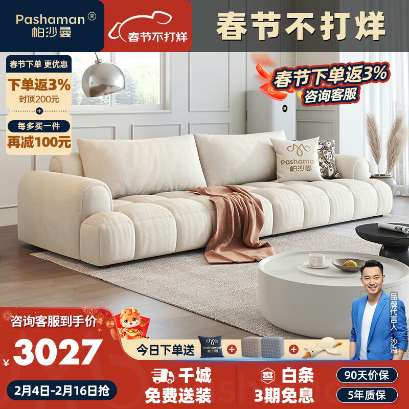 帕沙曼(pashaman)布艺沙发 泡芙棉花糖猫抓奶油风棉麻沙发钢琴键ins 2.7米 1005FZ价格:3147.00元!