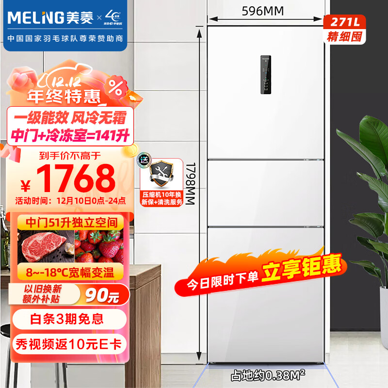 美菱(MeiLing)【离子净】271升三门家用冰箱变频一级风冷无霜低噪租房宿舍白色小型冰箱BCD-271WP3CX以旧换新价格:1768.00元!