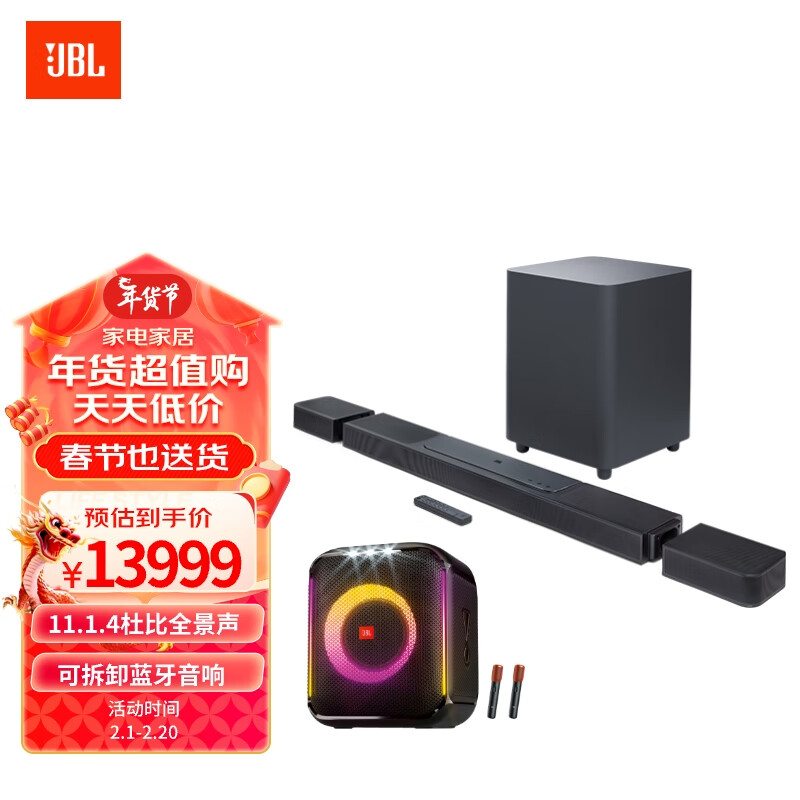JBLBAR1300X 旗舰款+音乐战将 室内外影音娱乐套装 电视音响 Soundbar 回音壁音箱+户外音响价格:13999.00元!