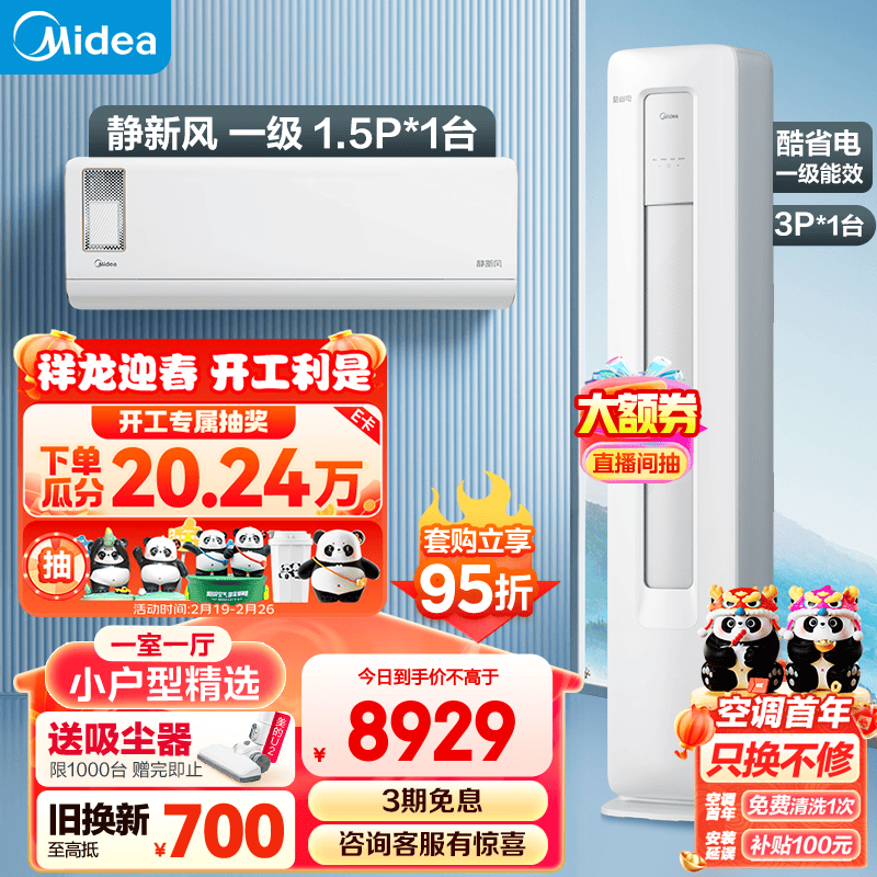 美的(Midea)新一级能效 空调套装 一室一厅 小户型精选(1.5匹静新风+3匹酷省电)价格:9398.00元!