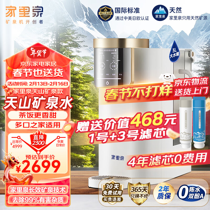 家里泉矿泉机 RO反渗透净水器家用台式即热净饮水机免安装加热直饮一体机天山矿泉款天山白3L水箱价格:2699.00元!
