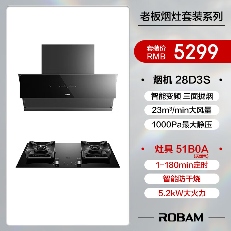 老板(Robam)抽油烟机大吸力家用油烟机三面拢烟变频烟机燃气灶灶具烟灶套装23风量吸油烟机28D3S+51B0A天然气价格:5299.00元!