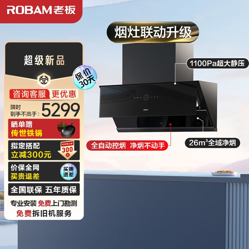老板(Robam)【灵犀烟灶联动升级】抽油烟机智能变频26风量侧吸式油烟机家用大吸力全自动吸油烟机29A9S烟机价格:5299.00元!