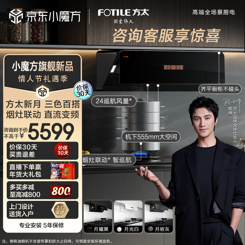 方太(FOTILE)抽吸油烟机灶具方太新月F1系列 家用侧吸变频24巡航风量烟灶联动01-F1A套餐天然气(三色可选)价格:5599.00元!