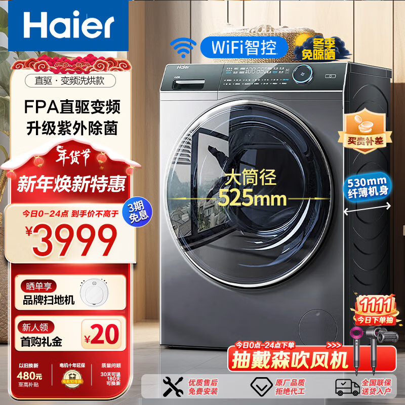 海尔(Haier)滚筒洗衣机10公斤超薄直驱变频洗衣机洗烘一体智能投放紫外线除菌525mm大筒径以旧换新价格:3999.00元!