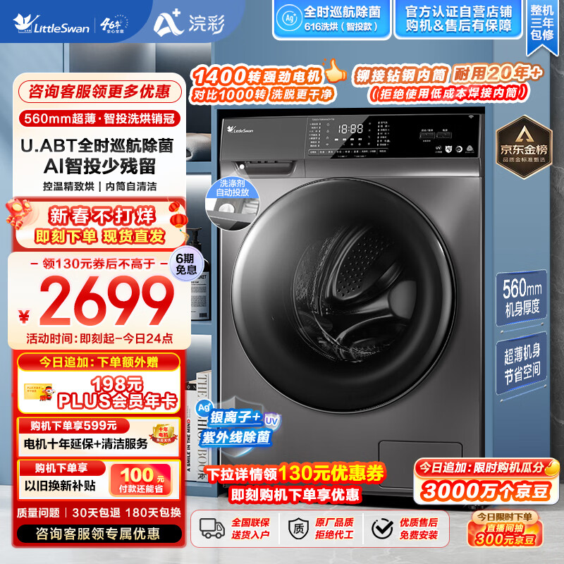 小天鹅(LittleSwan)滚筒洗衣机全自动 浣彩系列 洗烘一体 智能投放 超薄10公斤 TD100VT616WIADY-T1B价格:2799.00元!