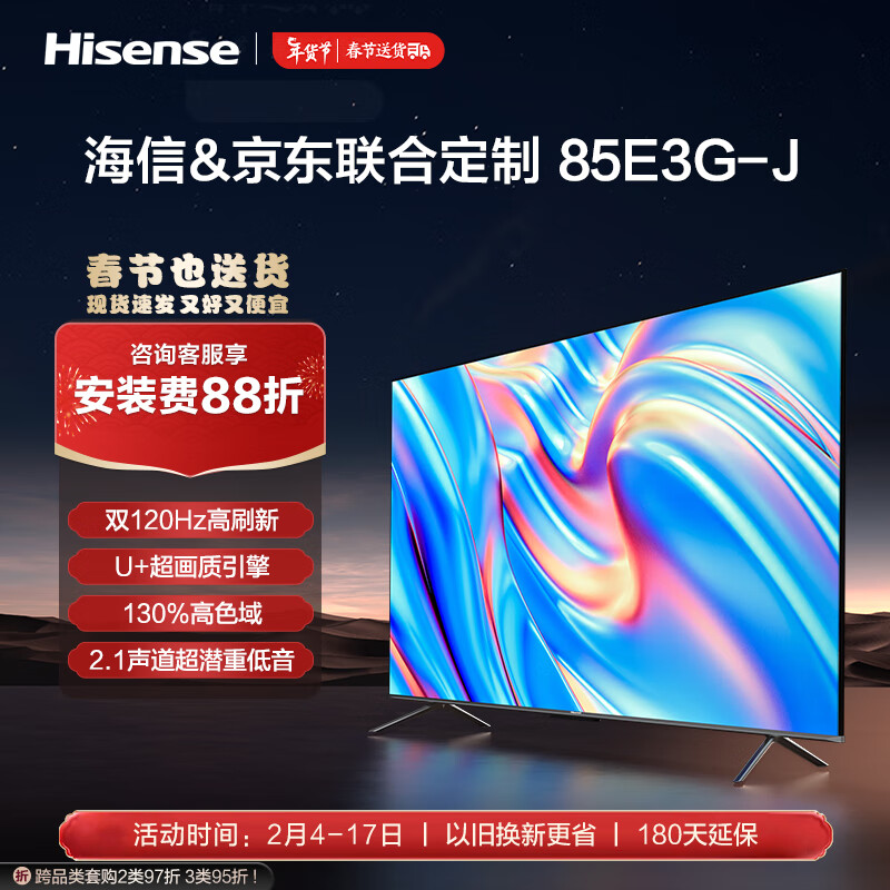 海信电视85E3G-J 85英寸 130%高色域 4K 120Hz超薄智慧屏 75客厅液晶智能平板电视机巨幕 以旧换新价格:4765.00元!