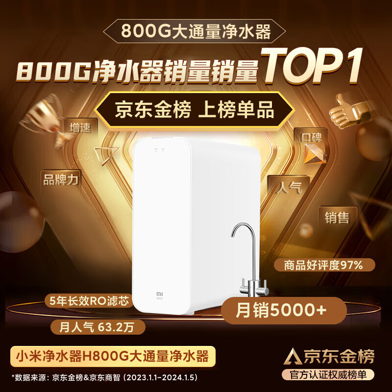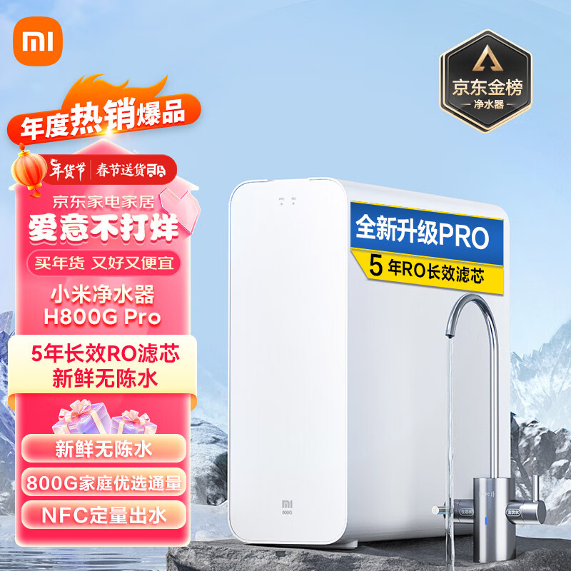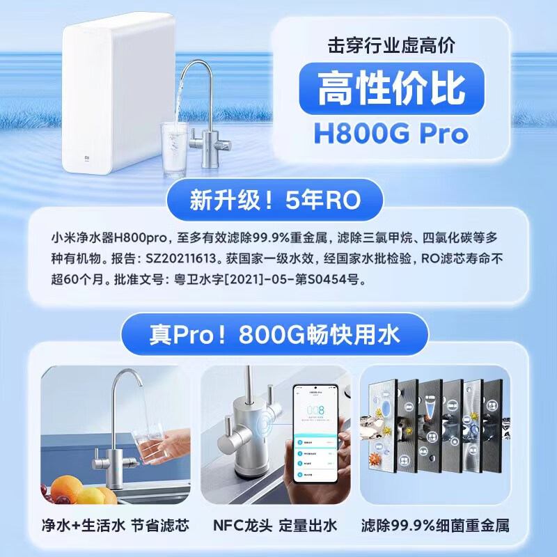 米家小米净水器家用净水机H800G Pro厨下式直饮机 六级过滤 5年RO反渗透 双出水龙头 无陈水 智能互联价格:1499.00元!
