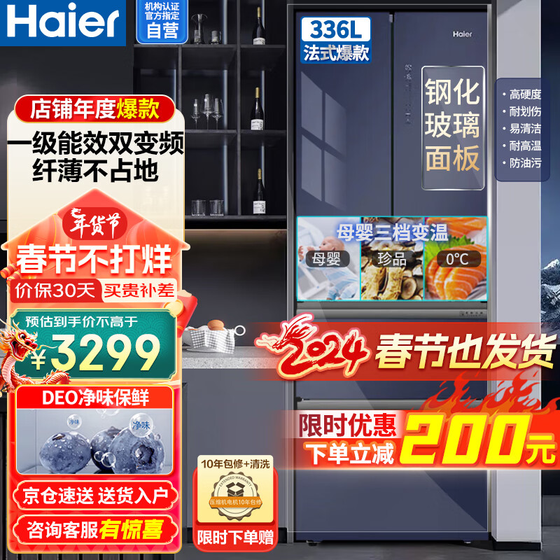 海尔(Haier)冰箱336升家用法式多门风冷无霜一级能效双变频大容量母婴变温净味钢化玻璃面板BCD-336WLHFD8DB1价格:3099.00元!