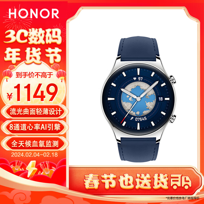 荣耀手表GS 3 环球远航智能轻奢手表14天强劲续航8通道心率AI引擎100+运动模式 龙年表盘新年礼物价格:1149.00元!
