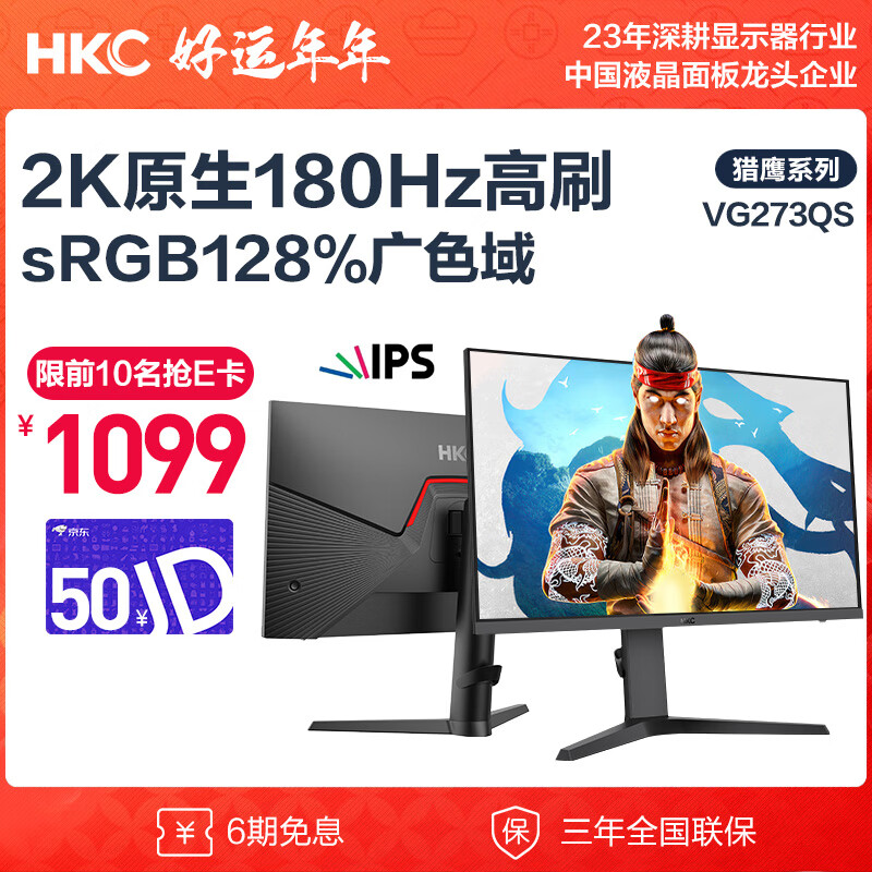 HKC 27英寸2K 180Hz FastIPS快速液晶显示屏 1ms 高清广色域旋转升降 专业电竞游戏显示器 VG273QS价格:1499.00元!