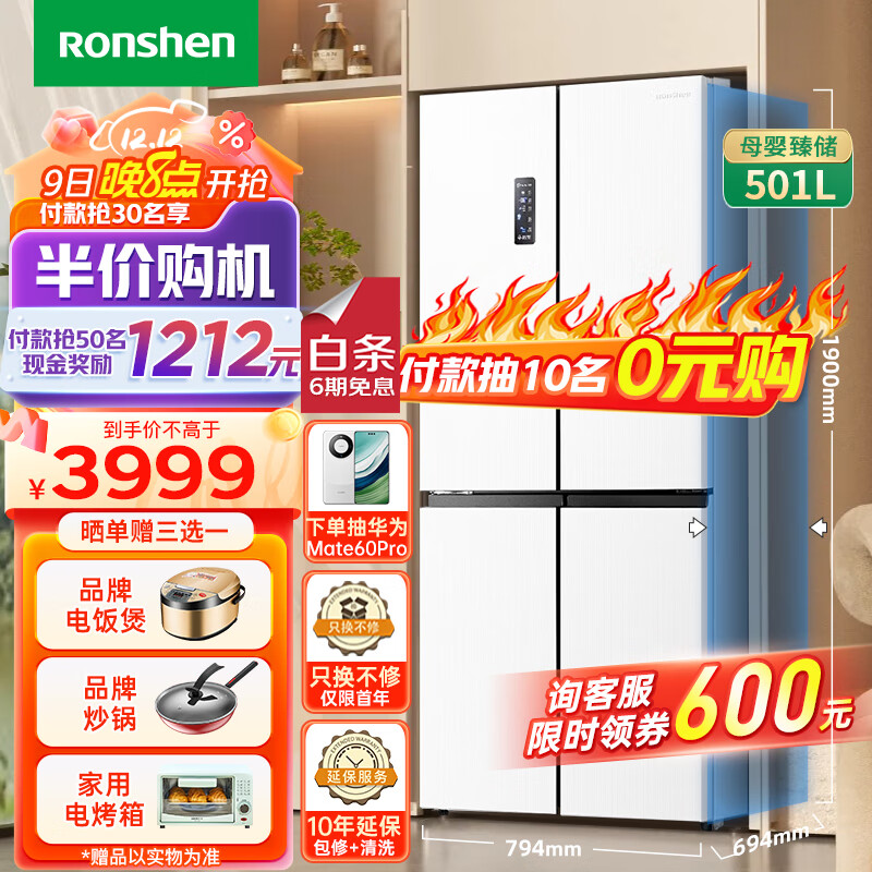 容声(Ronshen)蓝光养鲜501升十字对开四开门冰箱家用无霜变频一级能效BCD-501WD18FP大容量双循环白色价格:4599.00元!