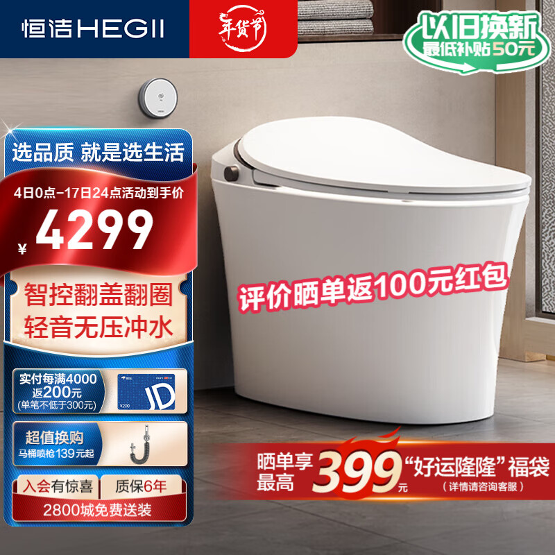 恒洁(HEGII)智能马桶Qs2Pro 挥手翻盖翻圈无水压限制智能坐便器HCE827B01-400价格:4999.00元!
