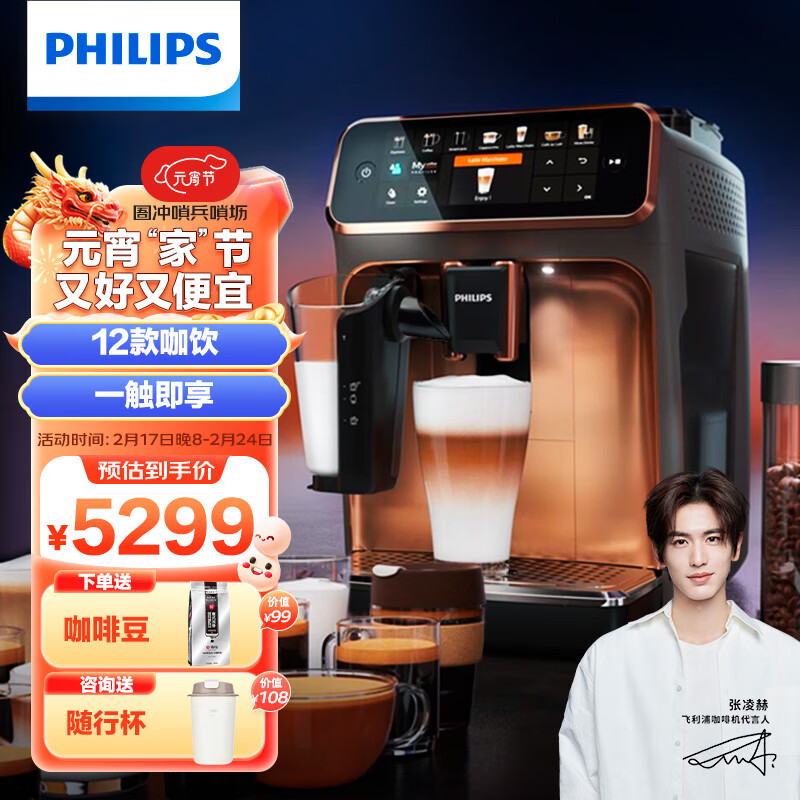 飞利浦(PHILIPS)云朵咖啡机5系EP5144/72 意式全自动浓缩家用现磨Lattego欧洲进口享12 种美味的咖啡送礼推荐价格:5299.00元!