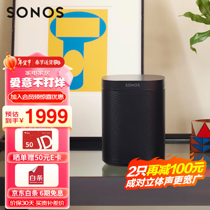 SonOS One 有源音箱 WIFI无线 多房间互联 环绕可组合 家庭影院 迷你音响 智能家用桌面客厅卧室书架 黑价格:1999.00元!