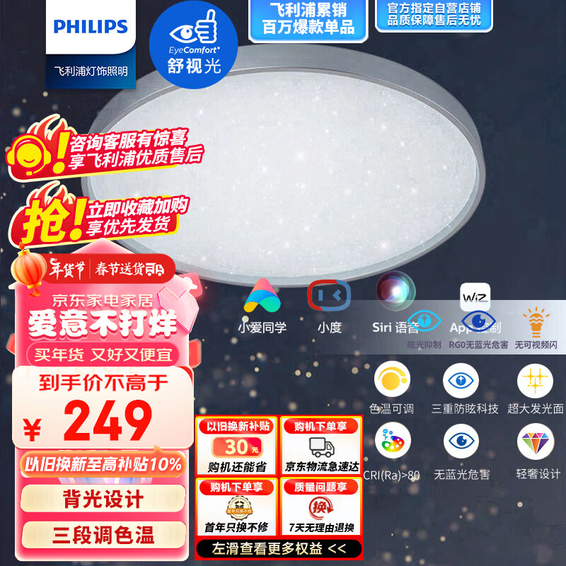 飞利浦led吸顶灯卧室灯客厅灯书房餐厅智能灯饰灯具智控调光24W星环 银价格:499.00元!