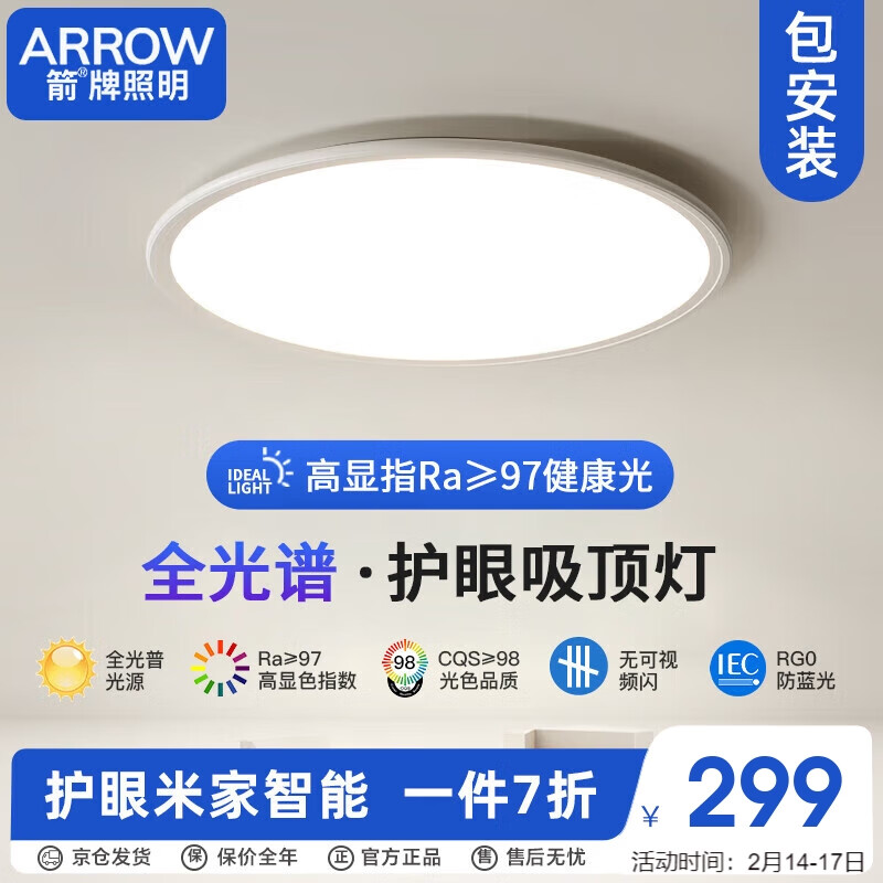 ARROW箭牌照明 客厅灯卧室护眼吸顶灯儿童房防蓝光led全光谱JPSXD6153价格:428.50元!