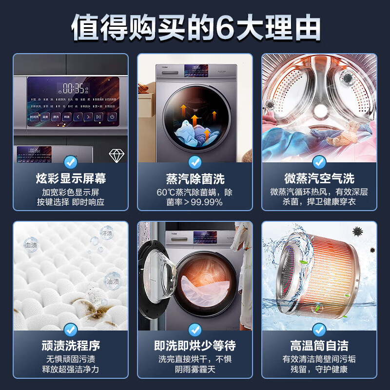 海尔(Haier)洗烘一体洗衣机全自动滚筒10KG变频家用一级能效智能预约触控晶彩屏微蒸空气洗香薰洗价格:2219.00元!