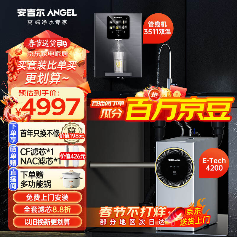 安吉尔净水器家用全屋净热一体套装管线机加热直饮RO反渗透纯水机套餐 1600G流速E-Tech4200+3511双温价格:4997.00元!