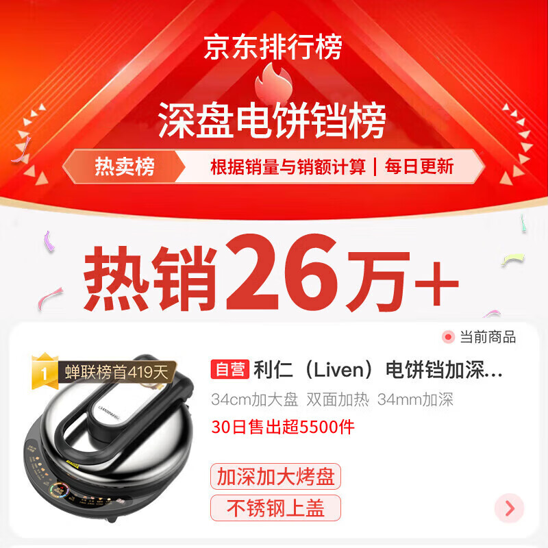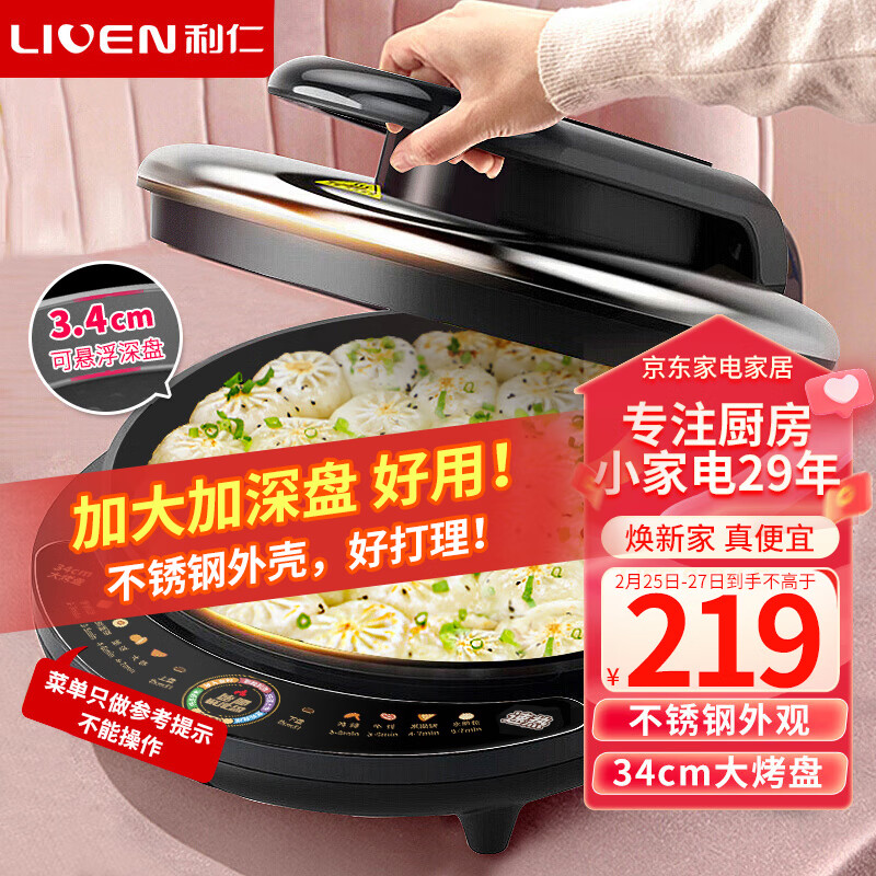 利仁(Liven)电饼铛加深加大家用电饼档大号双面加热烙饼锅煎饼锅三明治早餐机电饼锅大尺寸电煎锅LR-J8345价格:219.00元!
